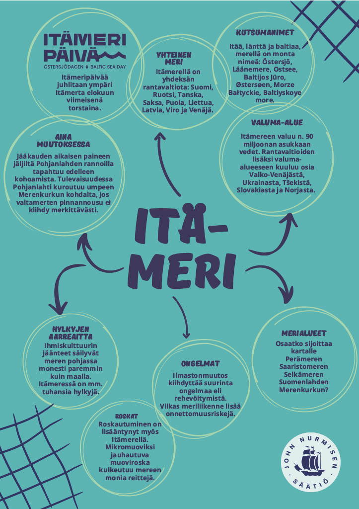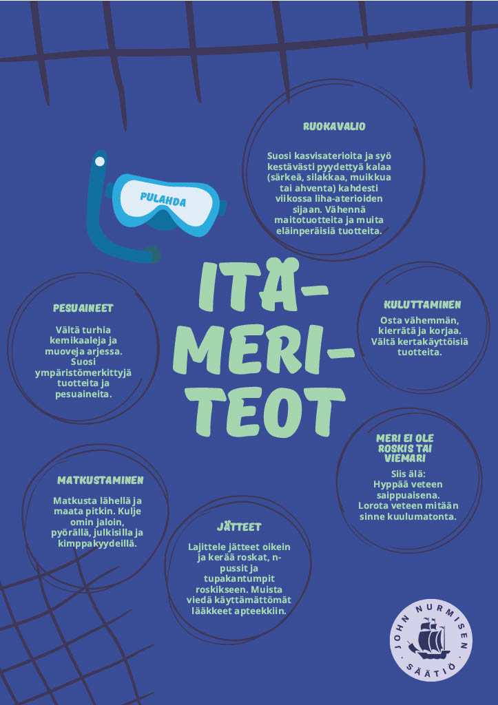 Tulostakaa Itämeri-julisteet koulun käytävälle tai luokan seinälle ja keskustelkaa niiden teemoista. Julisteista on tehty tehtäväkokonaisuudet alakouluille ja yläkouluille.